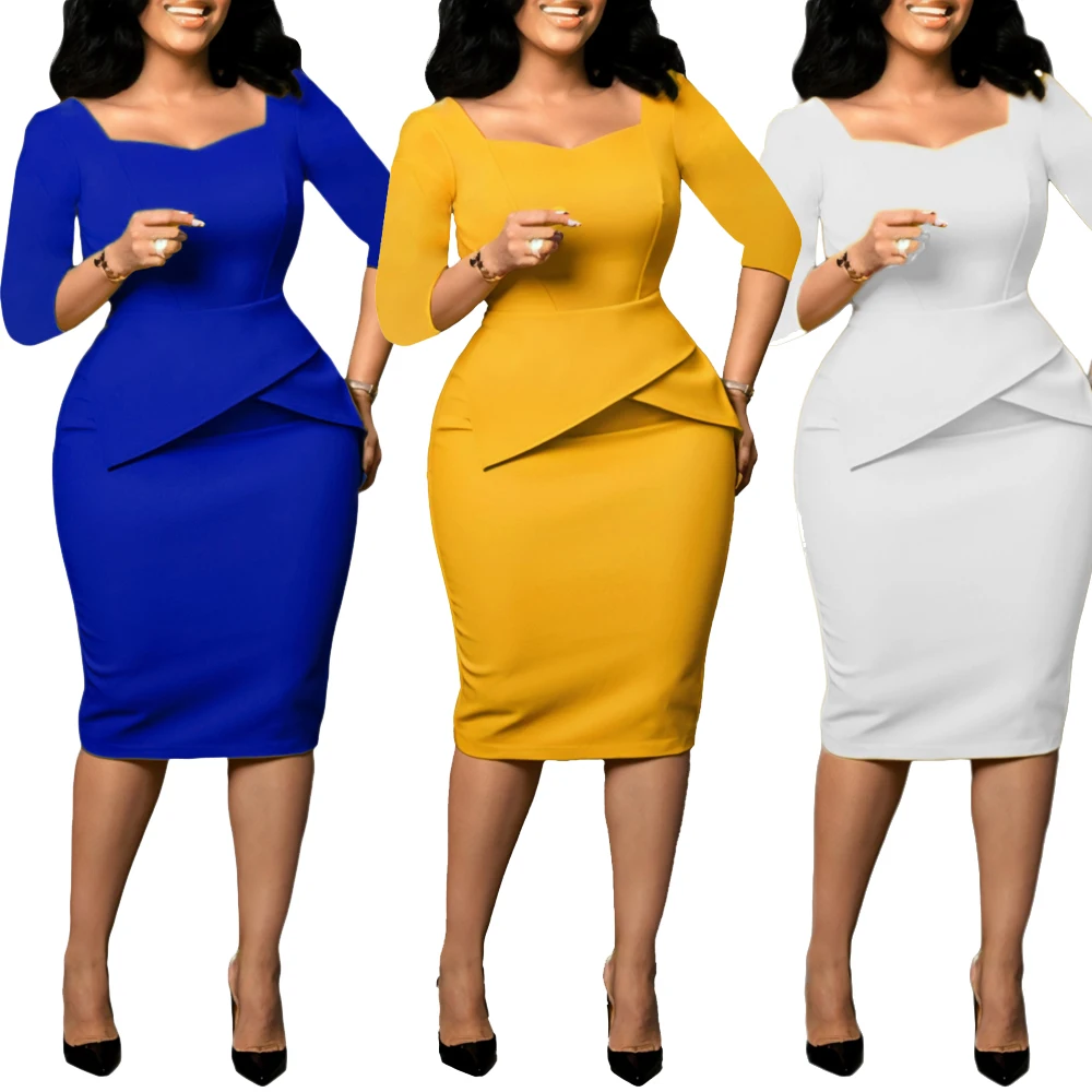 Church Dresses for Women 2025 Elegant Ladies Office Wear Casual Dress Long Sleeve Knee Length Solid Bodycon Peplum Pencil Dress