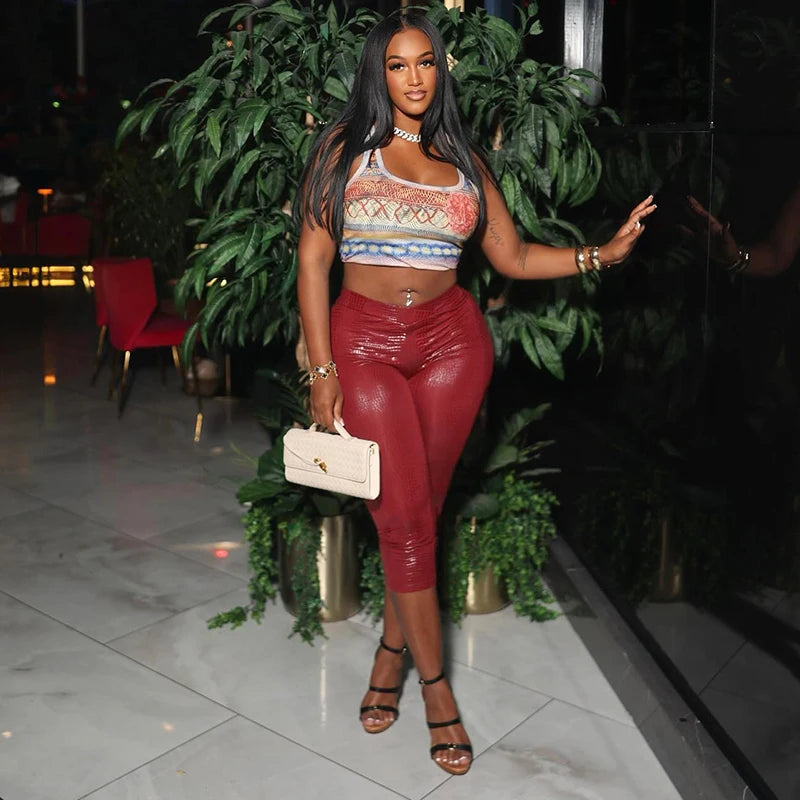 CUTENOVA Sexy Snake Print Solid Color Glossy Elastic High-Waisted Seven-Minute Casual Pants Summer New Women'S Clothing