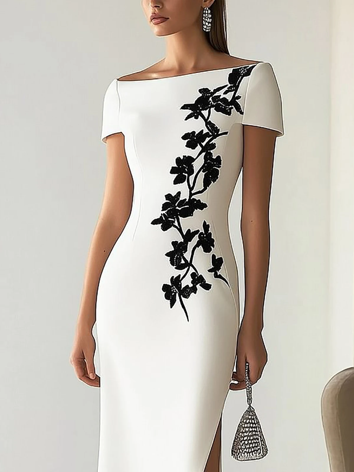 Elegant Floral Printed Women's Evening Dress Off-Shoulder Short Sleeve Slim Summer Dress High Waist Split Office Ladies Dresses