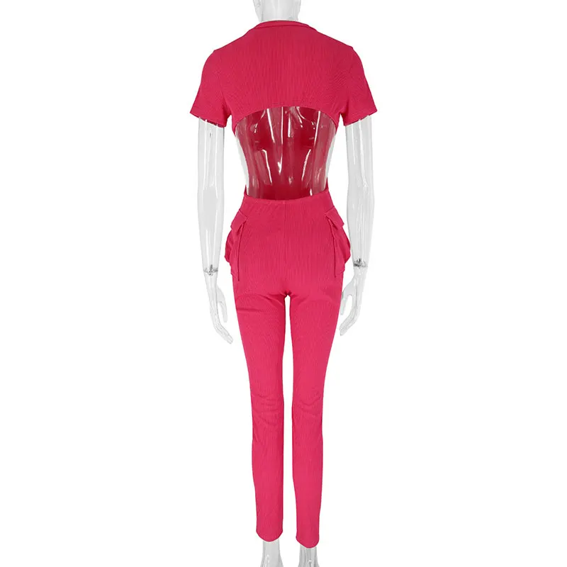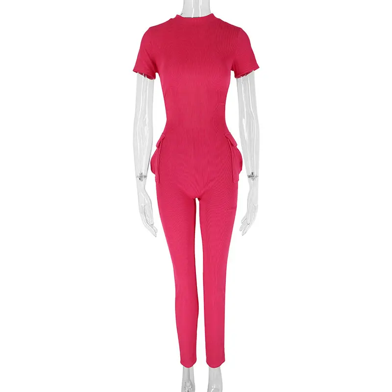 Spring New Women's Jumpsuits Sexy Sweet Pink Hollow Out Jumpsuit Streetwear Fashion Pockets Short Sleeve Female Elegant Rompers