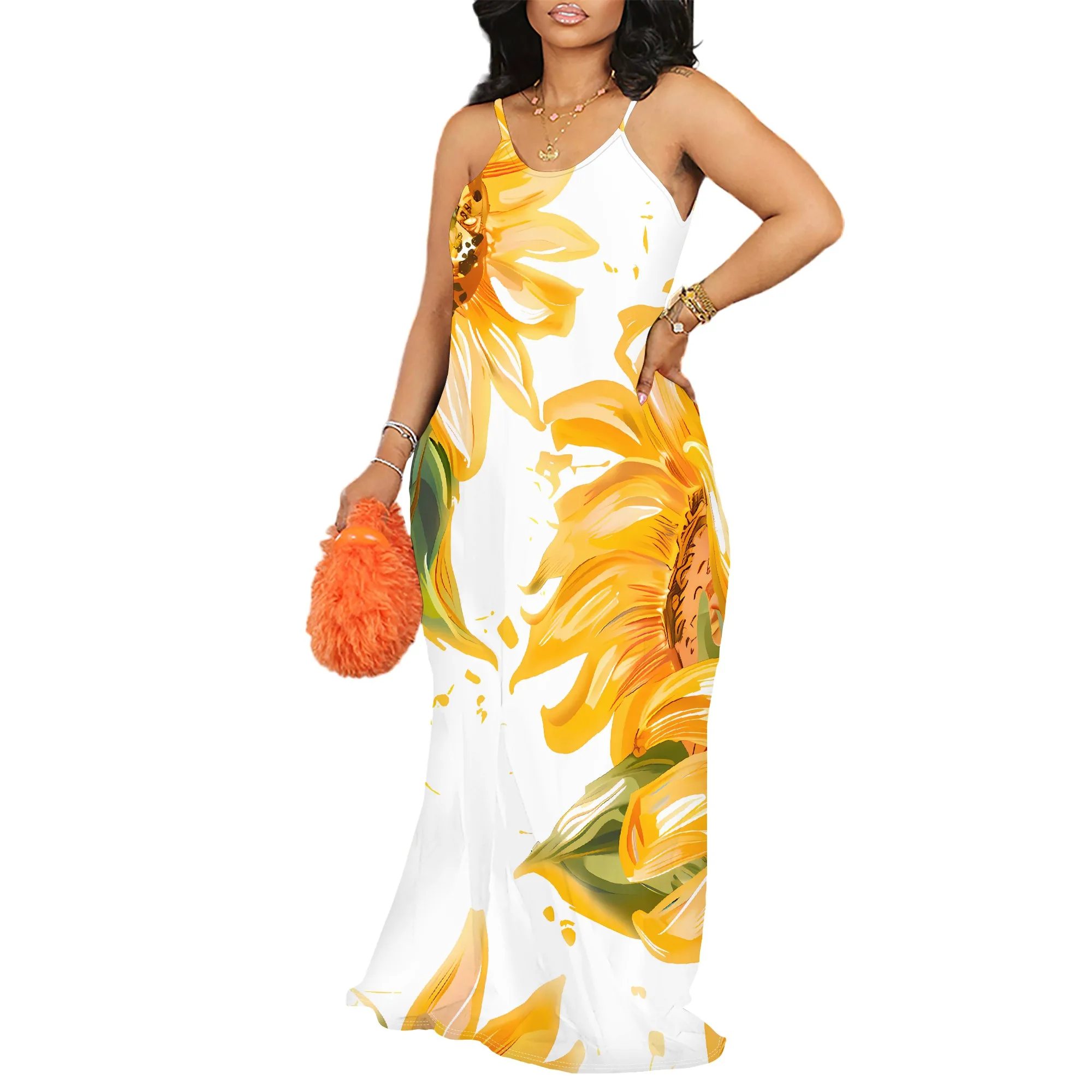 Womens Summer Sun Dresses Long Spaghetti Strap Sleeveless Floral Casual Long Maxi Dress